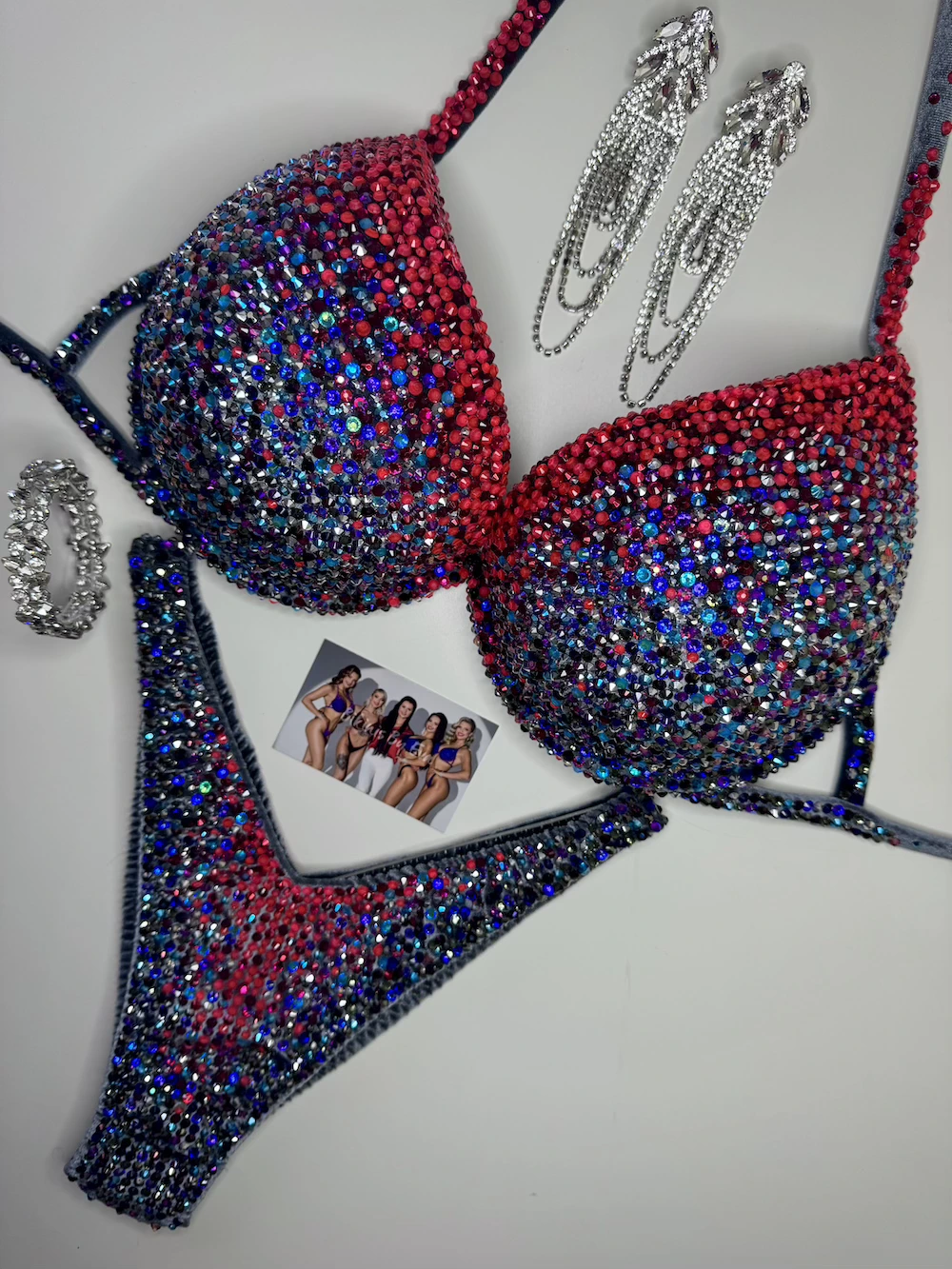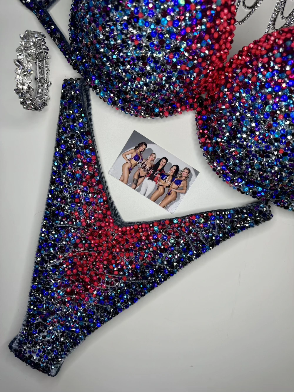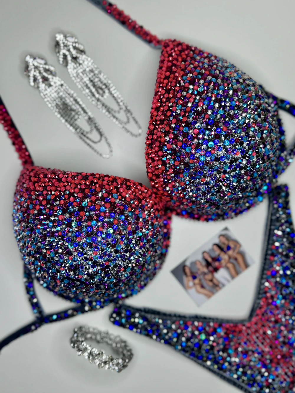 A total of 13 carefully layered colors form a complex, structured design with depth and precision. Controlled and focused, this design reflects strength and modern version of fitness competition suit.