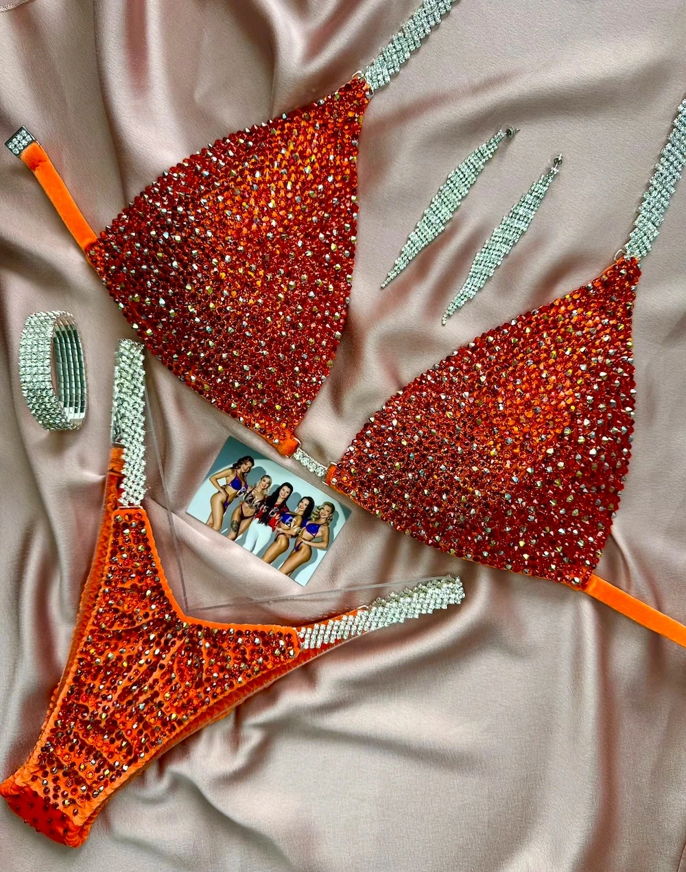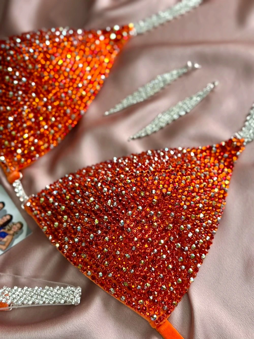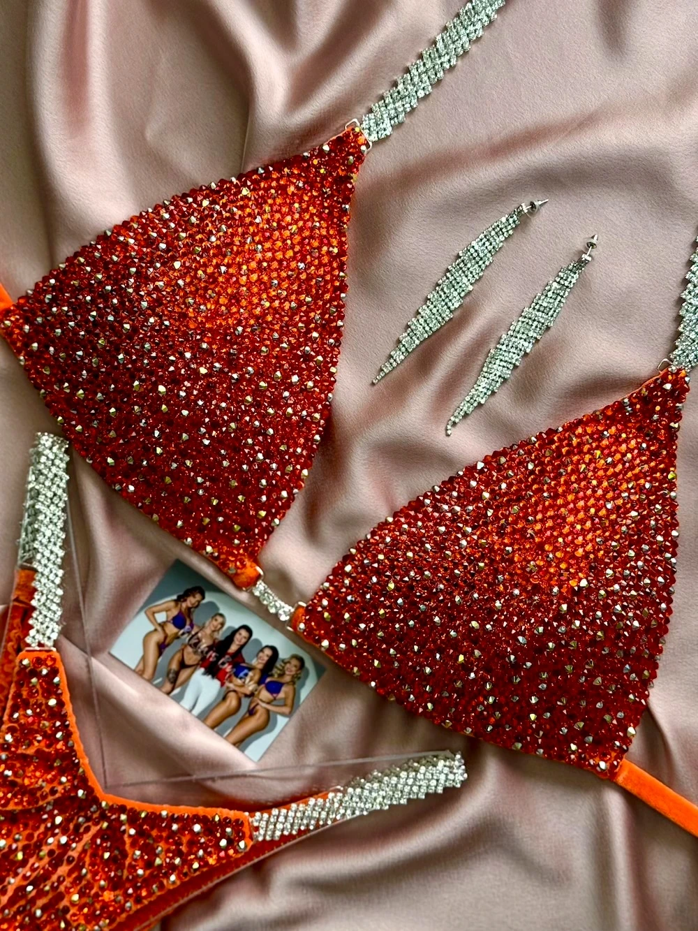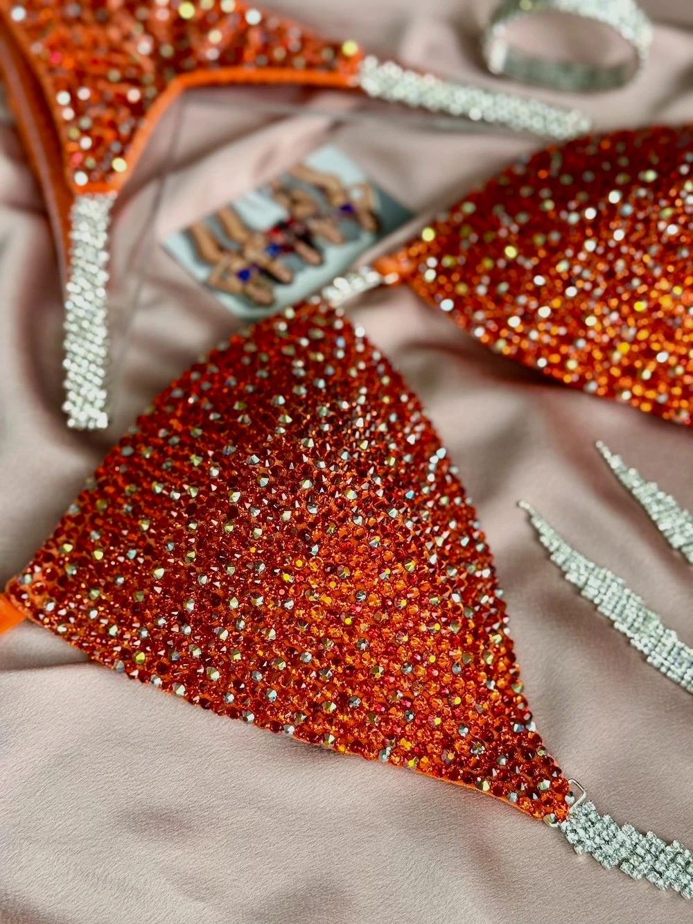 Bright orange velvet ignites in a blaze of five fiery crystal shades, blending molten oranges with sparks of red. A luxurious, powerful design for the woman who moves with passion, certainty, and the unmistakable glow of her inner fire.