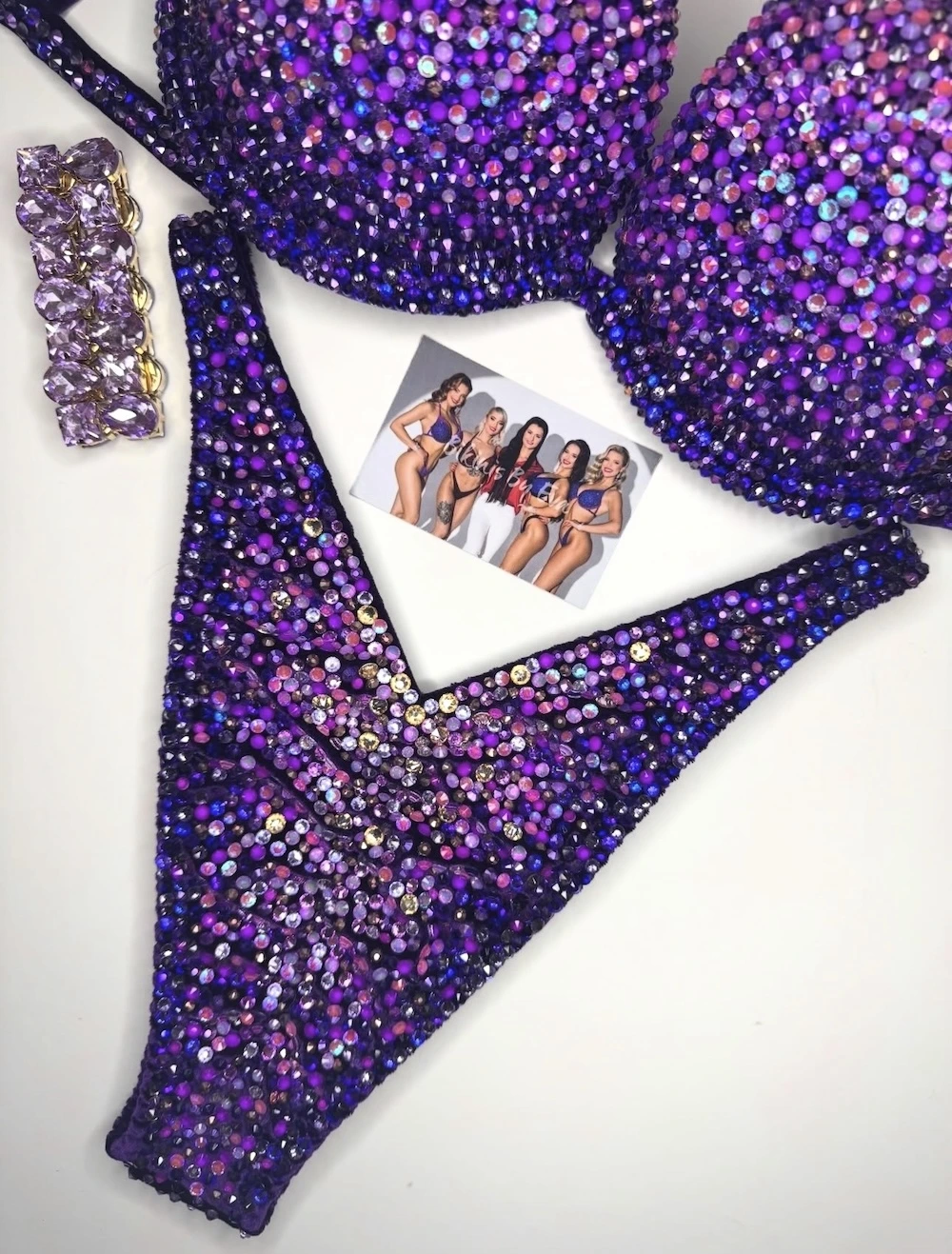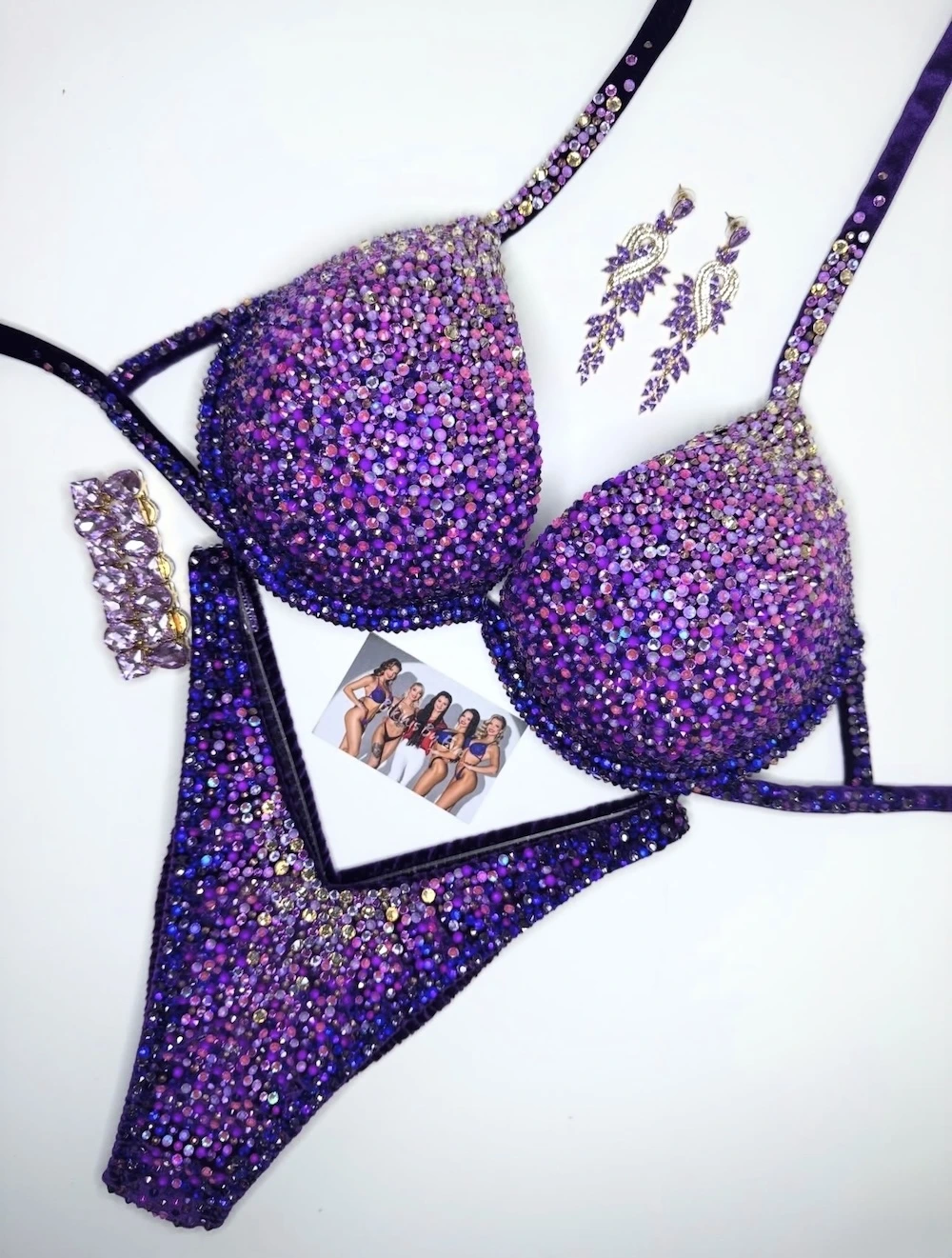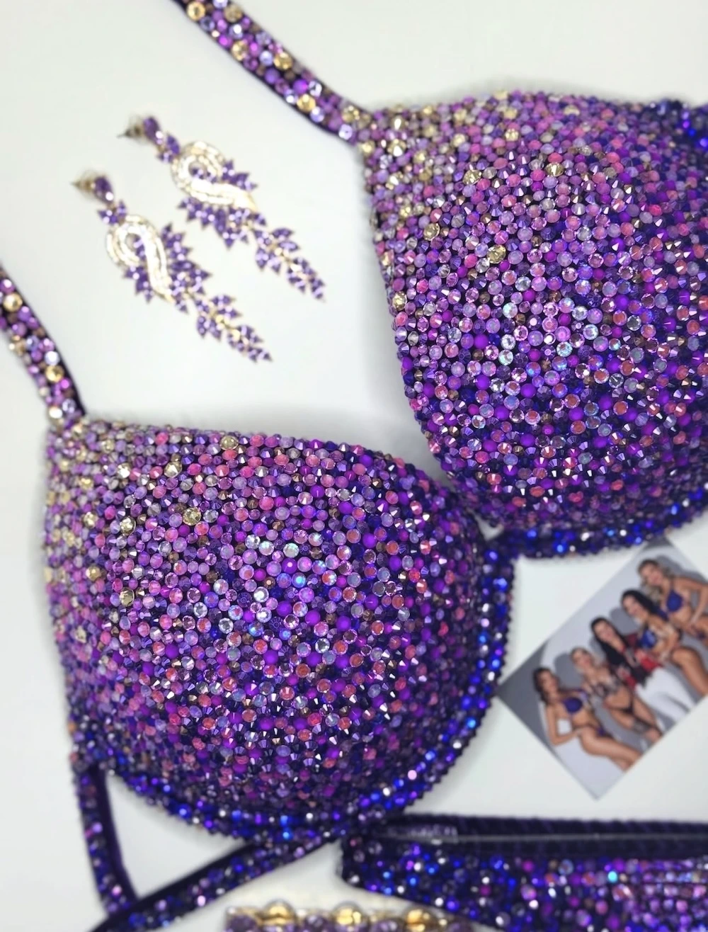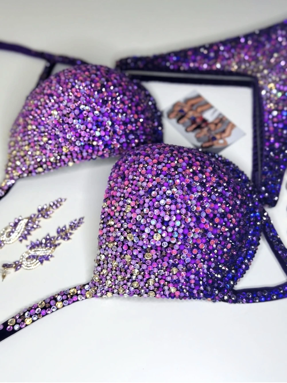 “Lullaby” fitness bikini features a deep eggplant velvet base blended with a carefully chosen mix of 14 crystal shades. The gradient creates a calm, mesmerizing flow of color while keeping strong stage presence. It is a refined, harmonious design that stands out with its balance of depth, detail, and modern elegance.