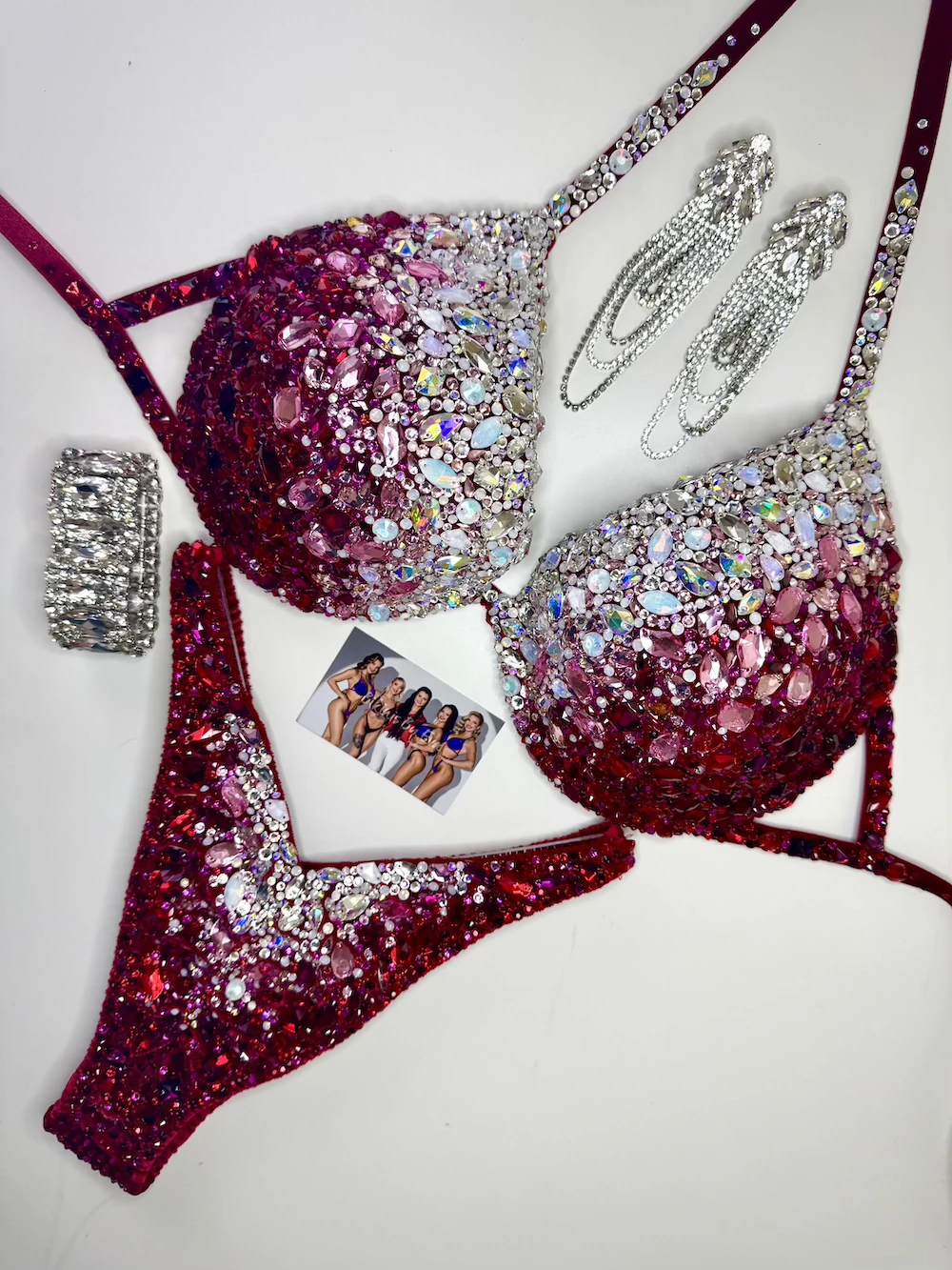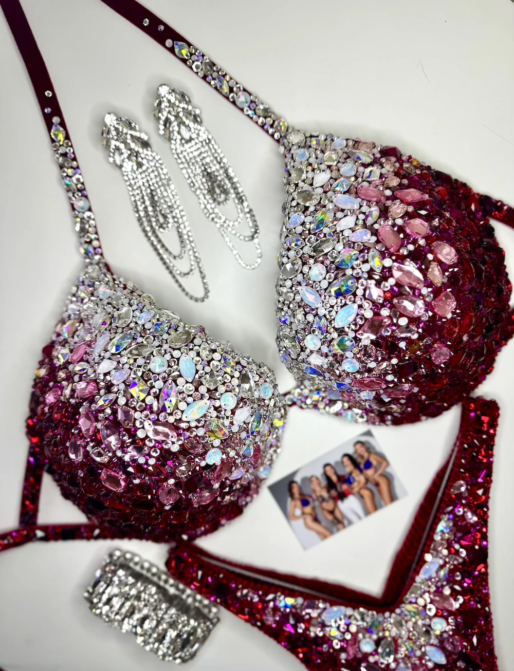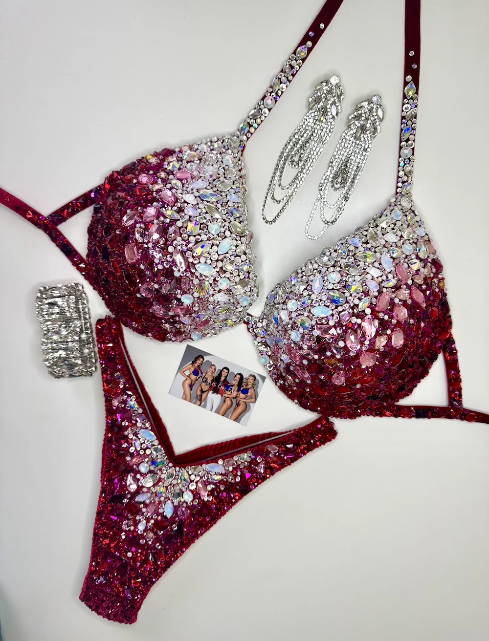 “Queen of Hearts” fitness competition design is a truly distinctive, made on a bright red velvet base, featuring an uncommon crystal transition from clear and opalescent tones into rose, fuchsia, and red. The refined color flow and precise detailing create a rare, feminine look that stands apart on stage.