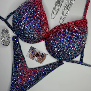 “Lullaby” fitness bikini features a deep eggplant velvet base blended with a carefully chosen mix of 14 crystal shades. The gradient creates a calm, mesmerizing flow of color while keeping strong stage presence. It is a refined, harmonious design that stands out with its balance of depth, detail, and modern elegance.