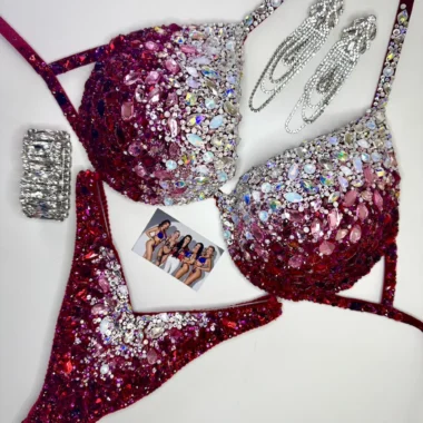 “Queen of Hearts” fitness competition design is a truly distinctive, made on a bright red velvet base, featuring an uncommon crystal transition from clear and opalescent tones into rose, fuchsia, and red. The refined color flow and precise detailing create a rare, feminine look that stands apart on stage.