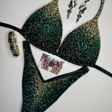 “Forest Fairy” is a dark green velvet fitness competition bikini designed for a rich, multidimensional stage look. The deep emerald base is fully covered with green and golden crystals, creating strong sparkle and depth under stage lights. This NPC/IFBB competition bikini is perfect for athletes looking for a standout green competition bikini for bikini, bodyfitness or wellness divisions. It can be created both on round or triangle cups according to your needs.