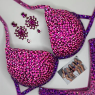 “Million magentas” – a fitness competition bikini design, created on deep pink velvet fabric adorned with 4 colors of crystals, featuring full coverage with large, dazzling stones. This lavish design seamlessly blends elegance with modern trends, that captures attention.