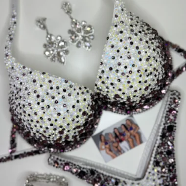 “Winter Veil” fitness bikini design features a soft white-to-dark ombré created with shimmering clear and AB crystals that gradually transition into deep wine tones. White-to-dark ombré designs are one of the latest trends on the fitness stage, offering a fresh alternative to traditional full-color looks. The contrast between the light upper section and rich darker base creates depth, elegance, and a luxurious stage look.