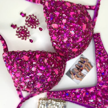 “Pink Venom” fitness bikini design – made from ash rose velvet with a striking bright pink base, this bikini features scattered silver, fuchsia, and chameleon red-blue rhinestones for a high-impact sparkle. Feminine, fiery, and ready to be worn on stage.